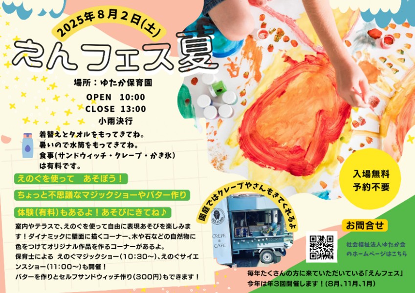 はい。子どもたちが喜んでくれることを、みんなで考えてたくさん企画しています。先日も地域の子どもたち向けの夏のイベントを開催し、大盛況でした。100人規模になることもあり、職員だけでは手が足りません。ボランティアの方の力が本当に必要です。ふくチャレの方にも、ぜひイベントの日に体験に来ていただけると嬉しいです。毎月1回、子ども食堂も開催しており、離乳食対応の回もあります。さらに、年3回のえんフェスも開催しています。秋と冬にも予定があるので、土曜日にお手伝いいただける方がいれば、ぜひお願いしたいです。